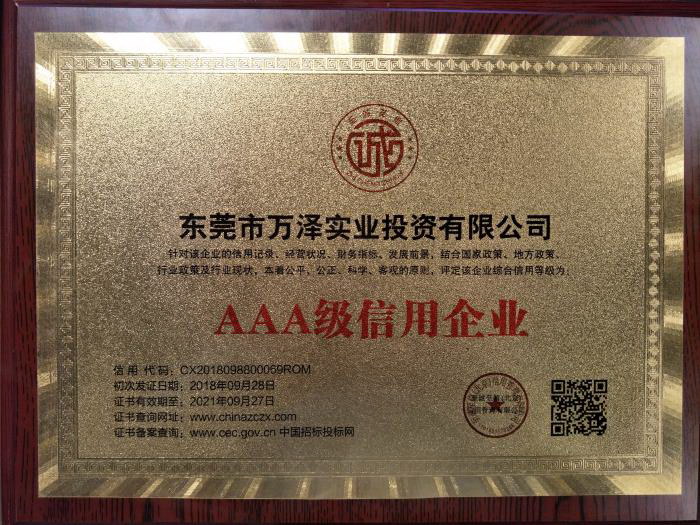 公司于2018年9月28日荣获由权威第三方信用评价机构至诚至信(北京)信用管理有限公司颁发的AAA级企业信用等级证书。充分表明了公司的信用水平和发展能力以及极强的社会责任感。