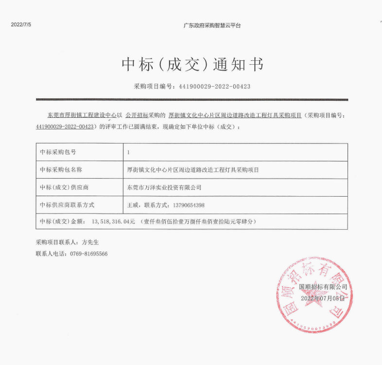 百舸争流千帆竞,乘风破浪正远航。7月5日,星空(中国)喜讯连连!我司连续中标两个项目,分别为厚街镇文化中心片区周边道路改造工程灯具采购项目与东莞市高埗镇冼沙股份经济联合社社区环卫保洁服务采购项目,中标金额合计超1882万元!